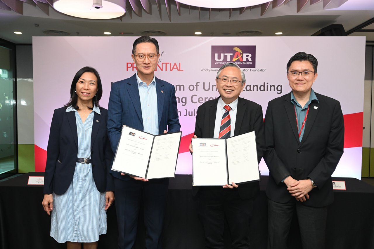 Kuala Lumpur, 4 July 2024 – Prudential Assurance Malaysia Berhad (PAMB) and Universiti Tunku Abdul Rahman (UTAR) today signed a Memorandum of Understanding (MoU). This MoU aims to help soon-to-be graduates in business and finance studies kick-start their career journey.