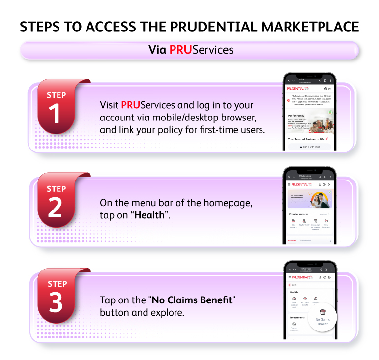 Enjoy up to RM1,000 in annual No Claims Benefit, redeemable on Prudential Marketplace.