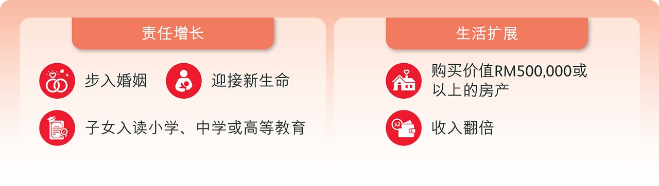 保障升级权益(Assurance Upgrade Privilege)允许您在受保人发生人生里程碑事件后的180天内,无需额外核保即可提高附加保单的保额。此权益可在附加保单生效后的首10个保单年度内 行使,且须在 投保年龄ANB 50岁前。每张保单仅可行使一次,最高可增加原有附加险保额的50%,并且每位受保人最高以RM300,000为限。任何附加保单保额的增加,可能会导致保费相应提高。
